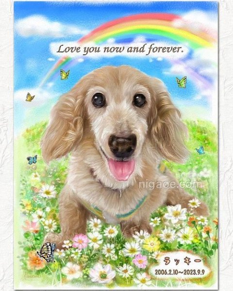 背景は虹の橋とお花畑、天使を描かせて頂きました。