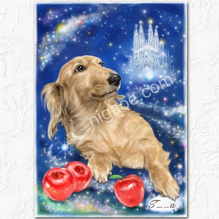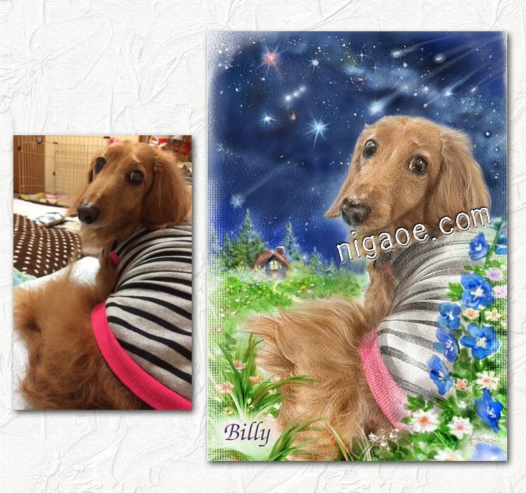 BARONちゃんの似顔絵です🐾🎨背景は星空⭐️と桜🌸を描かせて頂きました。星空と夜桜の幻想的な雰囲気の中に佇むBARONちゃんが、美しいオーラを放っています✨